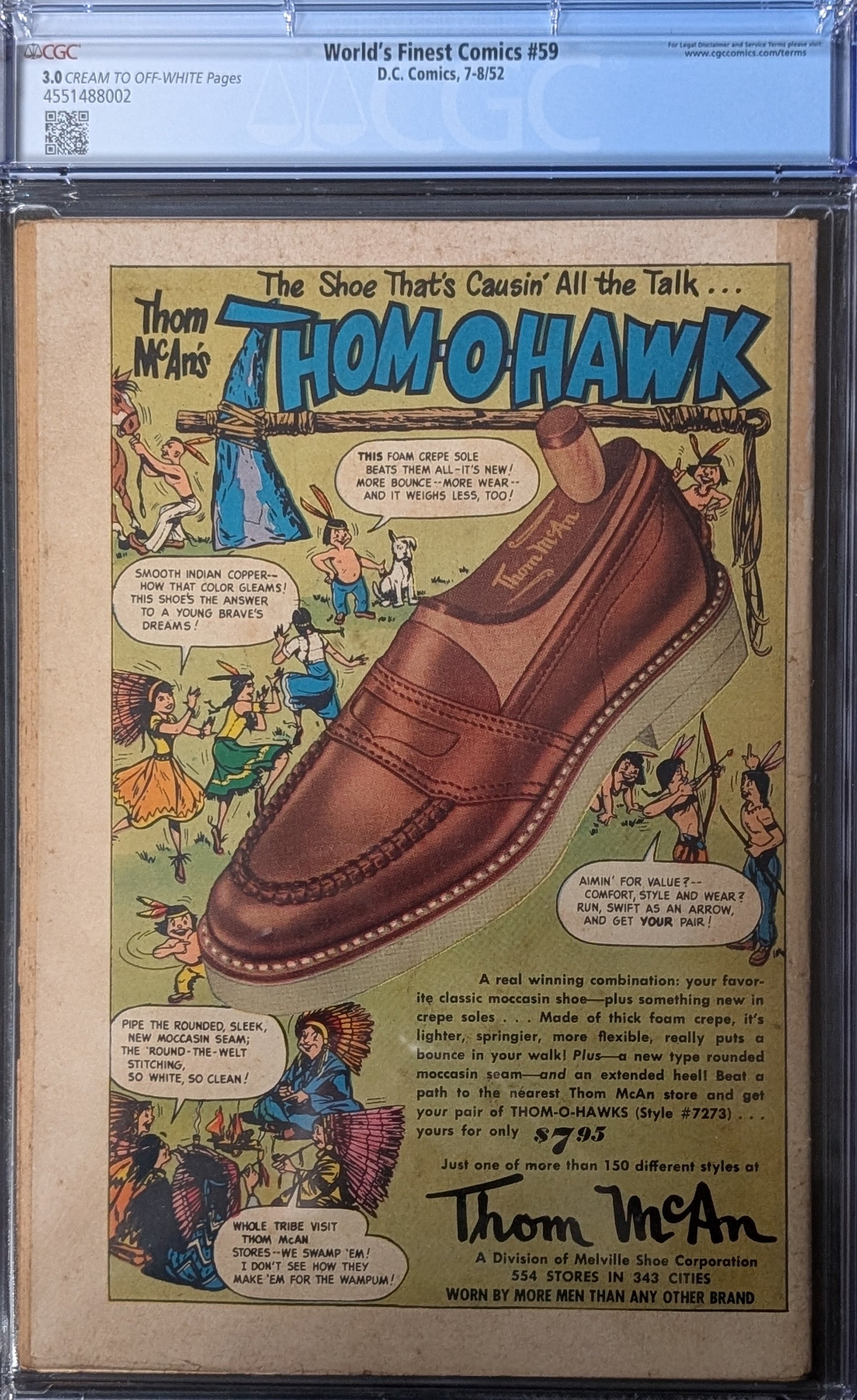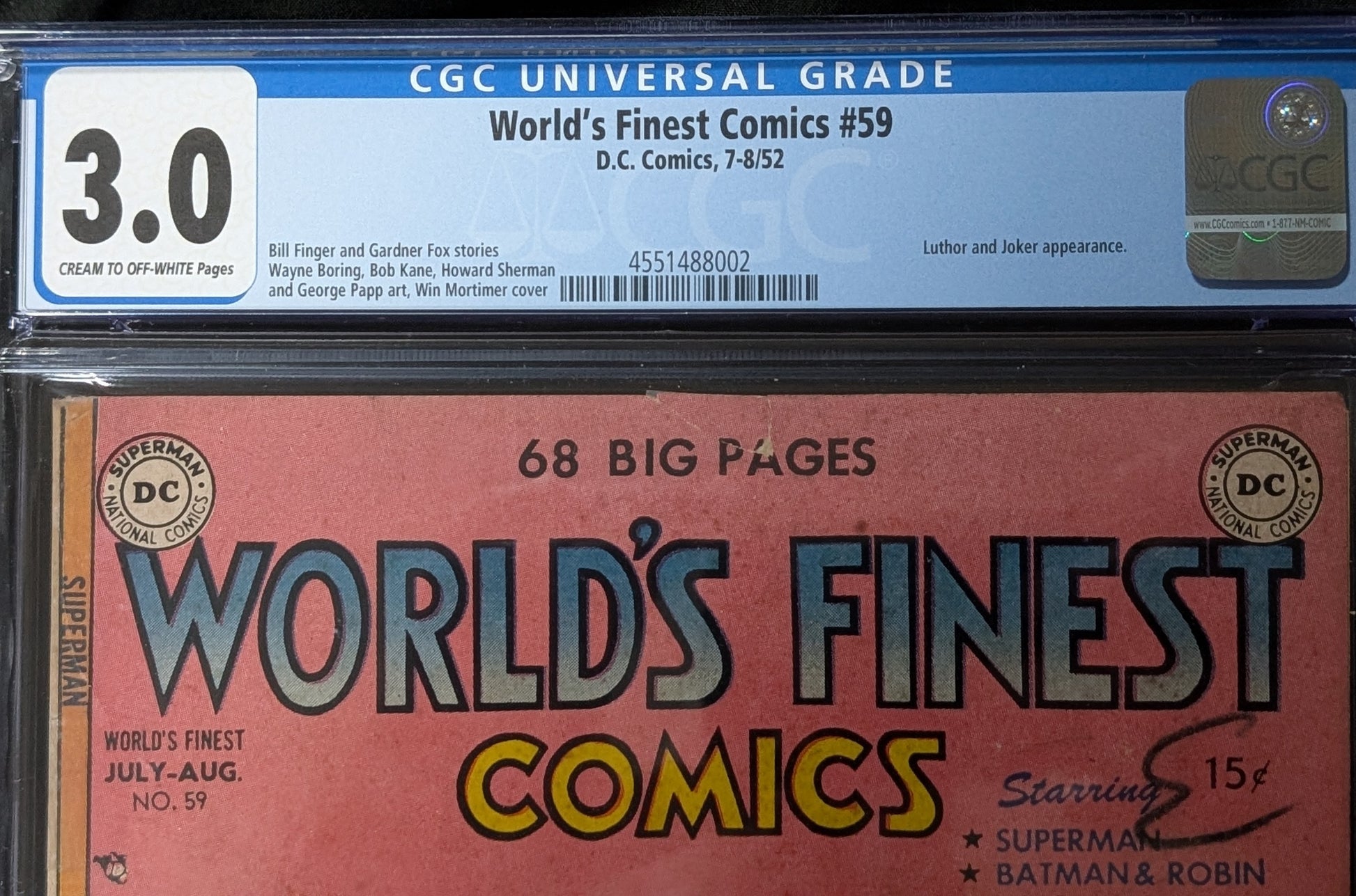 World's FInest # 59 graded by CGC at a 3.0 (Good/Very Good) with Batman, Robin, and Superman. This comic is from July/August 1952.